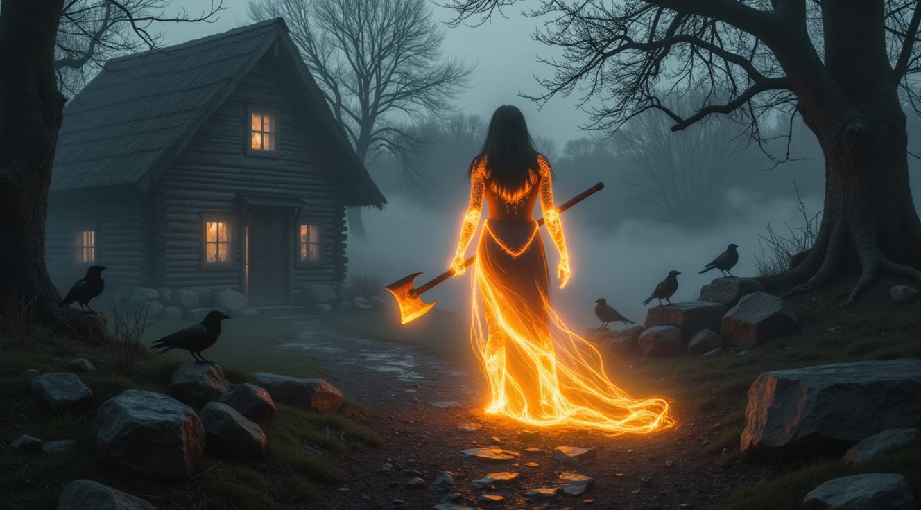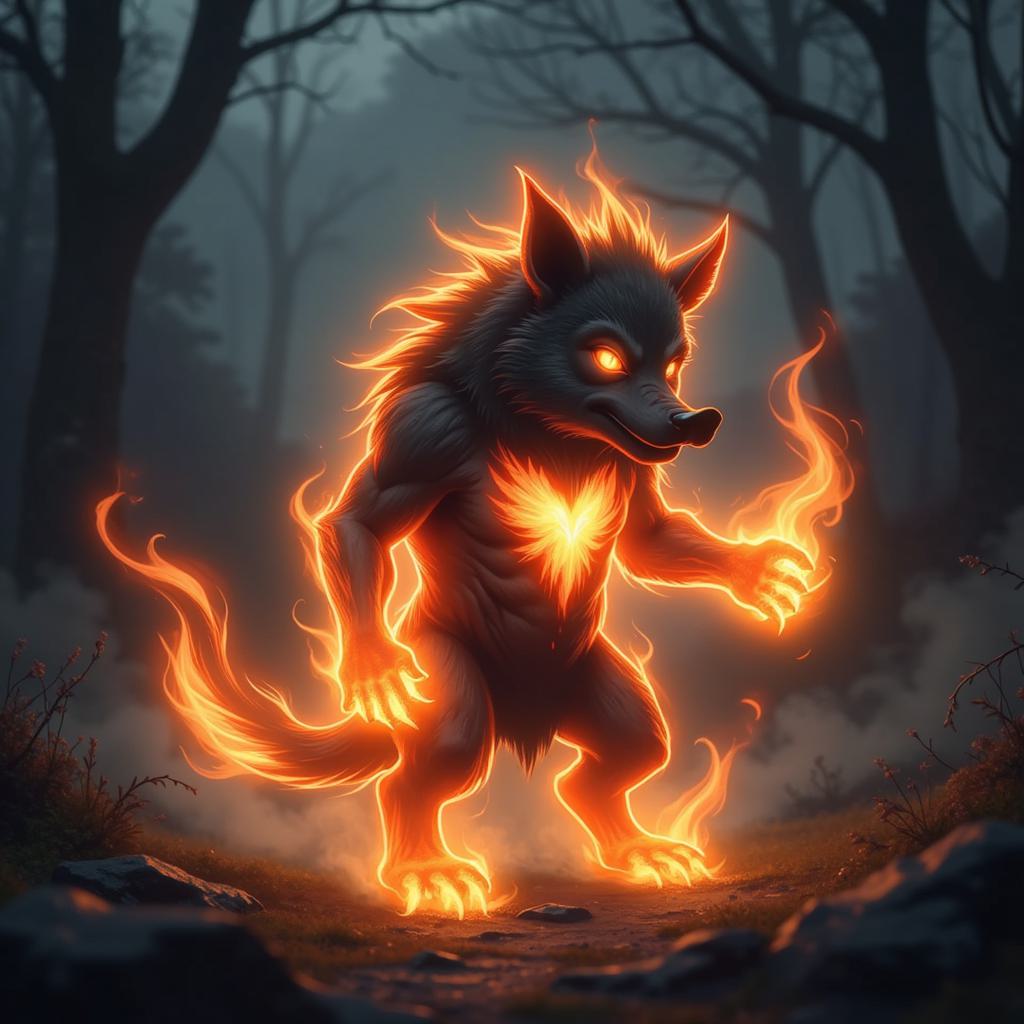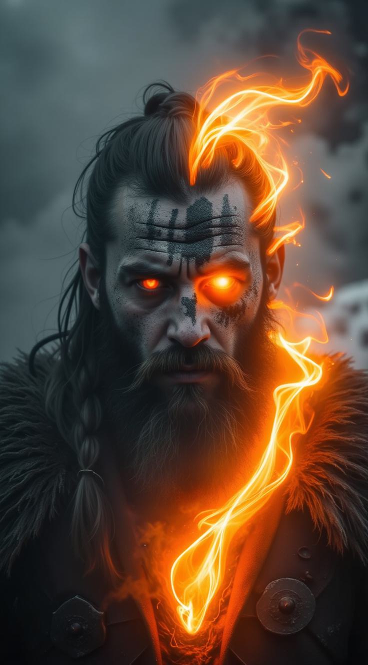 Сгенерируй арт в стиле тёмного фэнтези: лицо бородатого воина с суровым выражением, заплетённой косой и руническими узорами на лбу. Одна половина лица выполнена в холодных серых тонах, другая охвачена ярким пламенем. Глаза светятся интенсивным оранжевым светом. Вокруг головы — клубы дыма и раскалённые угли. В нижней части композиции — огненный наконечник копья или топора. Фон — глубокий чёрный. Стиль — детализированный, с акцентом на текстуры волос, бороды и пламени