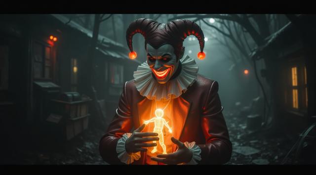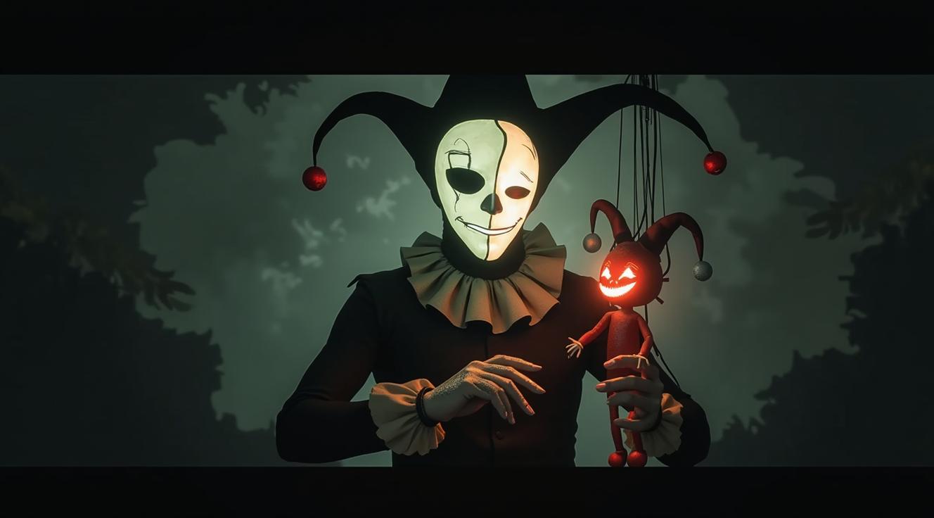 сегодня, Персонаж арлекин в стиле игры don't starve. Анфас. На голове шутовской колпак. Лицо скрыто белой маской, одна половина которой смеётся, а другая плачет. Перед сабой держит руки, к пальцам привязаны нити марионетки которой он управляет. Марионетка тряпичная кукла, по типу вуду, с выше ой улыбкой и пуговицами вместо глаз. Цвета мрачные