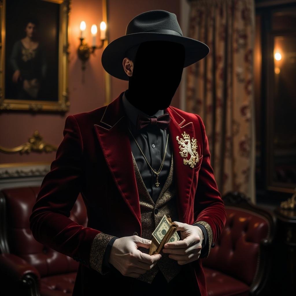 Фотография молодого испанца (25-30 лет) в идеально сидящем бордовом бархатном пиджаке с гербом-вепрем, черная рубашка с бабочкой. Вместо лица — черная пустота с острой улыбкой Венома. Широкая шляпа отбрасывает глубокие тени. Белые перчатки держат пачку долларов и сигару. Фон: богатый мафиозный кабинет 1990-х с темными деревянными панелями. Стиль: кинематографичный нуар, драматичный свет,