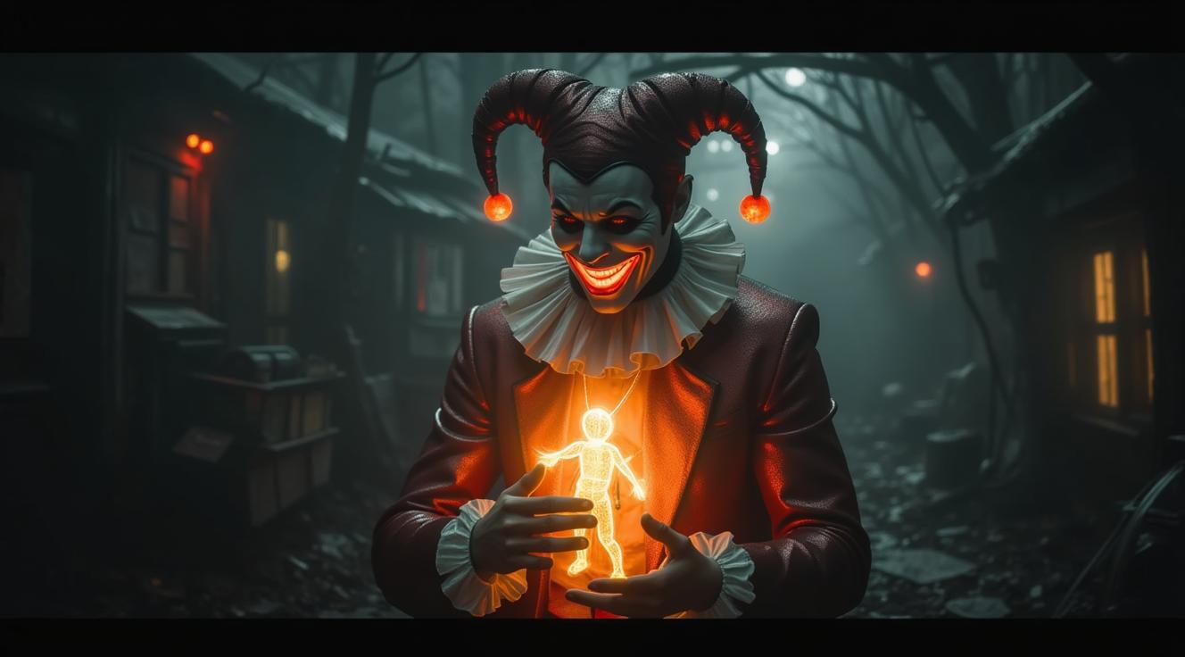 Персонаж арлекин. В стиле игры don't starve. Анфас. На голове шутовской колпак. Лицо скрыто белой маской, одна половина которой смеётся, а другая плачет. Перед сабой держит руки, к пальцам привязаны нити марионетки которой он управляет. Марионетка тряпичная кукла, по типу вуду, с выше ой улыбкой и пуговицами вместо глаз. Цвета мрачные