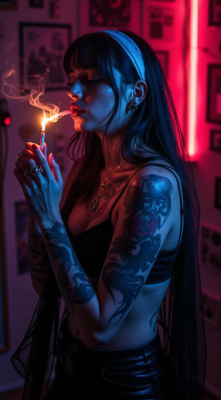 фотореалистичный киберпанк-готический портрет A hyper-realistic close-up portrait of a tattooed woman wearing a black veil and a white headband, smoking a cigarette with a glowing ember. Neon red and magenta backlighting with cool blue accents, dramatic chiaroscuro shadows, visible tattoos on the neck and chest, a silver cross necklace, moodily smoky atmosphere, shallow depth of field, cinematic lens look, ultra-detailed skin textures, 8K quality, 35mm perspective.