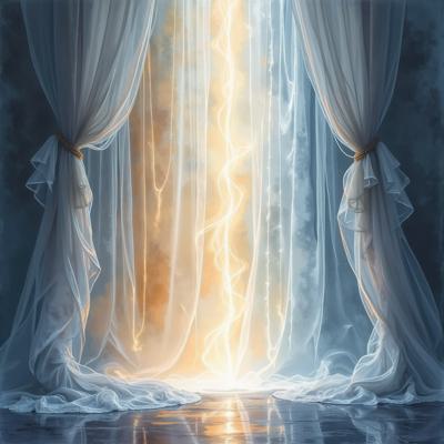 Акварель гиперреализм. Театральная сцена. Фоном белые драпировки спадают на пол ровными складками. лучи света подчёркивают рельеф складок из шёлковистой ткани. Перед этим читаются ровные вертикальные линии прозрачных гармоничных цветов стеклянных толстых четырёх колон, подсвеченных светом снизу как будто изнутри. Сверху фалдами провисают белые ленты.