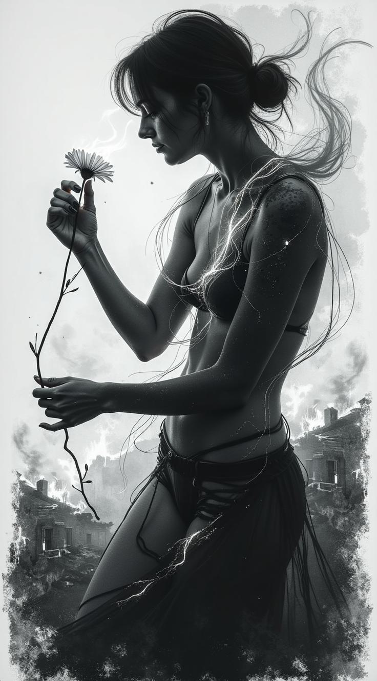Символическая черно белая гравюра, разделённая на два плана. Драматический контраст близкого жеста и далёкого разрушения., Передний план:, Женская рука (тонкая, с изящными, но напряжёнными пальцами) держит цветок на стебле. Цветок горит. , Задний план: силуэты горящих домов. Не детальные, а размытые, как кошмар обрушенные крыши, остовы башен., Высококонтрастная гравюра. Только чистый чёрный, белый и агрессивная штриховка.