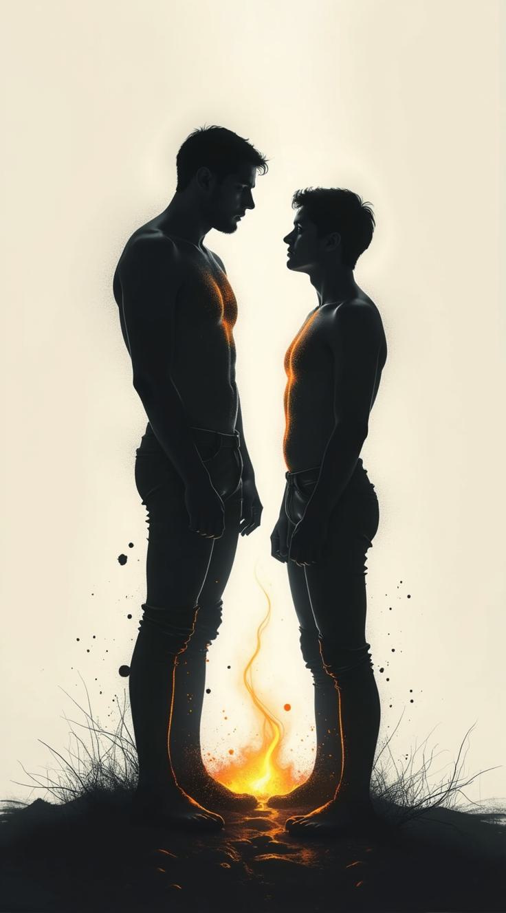 Минималистичная графика, тушь, экстремальный контраст. Два человеческих силуэта стоят друг напротив друга, разделенные широким пустым пространством., Левый силуэт (мужской): Высокий, широкоплечий. Состоит из вертикальной штриховки, как сдерживаемый голод. Слегка наклонен вперед, как будто собирается перейти в наступление., Правый силуэт (женский): Минимально отклонен назад, как будто собирается отступить. Статика оцепенения и отзыва., Пространство между ними: Широкая полоса чистого белого. , Глубокий черный фон. Ни лиц, ни деталей — только форма, поза и ощутимое немое желание.