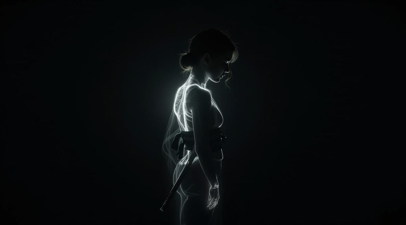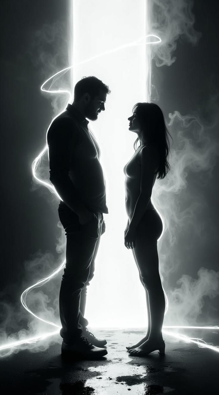 Экспрессивная чёрно-белая силуэтная иллюстрация с вытянутой пластикой фигур и театральным светом. Мужчина и женщина друг напротив друга, разделенные широким пустым пространством., Левый силуэт (мужской): Высокий, широкоплечий. Состоит из вертикальной штриховки, как сдерживаемый голод. Слегка наклонен вперед, как будто собирается перейти в наступление., Правый силуэт (женский): Минимально отклонен назад, как будто собирается отступить. Статика оцепенения и отзыва., Пространство между ними: Широкая полоса чистого белого. , Глубокий черный фон. Ни лиц, ни деталей — только форма, поза и ощутимое немое желание.