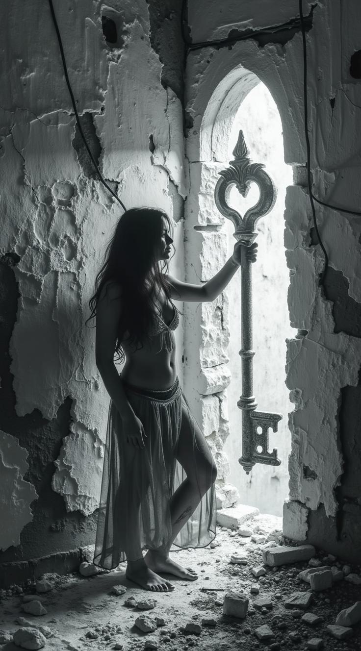 книжная иллюстрация, высокая детализация, черно-белая, стиль Альбрехта Дюрера, викторианская готика, высокая контрастность, старая оштукатуренная стена в полумраке, мощный стальной ключ вбит в штукатурку до половины своей длины, от ключа по стене во все стороны расходятся глубокие трещины в штукатурке, словно от сильного удара, некоторые трещины тянутся до края изображения, штукатурка местами осыпалась, обнажив кирпичную кладку под ней, свет падает сверху слева, подчеркивая рельеф трещин и блеск стали ключа, атмосфера необратимости, разрушения и бесповоротного решения, минимализм, символизм