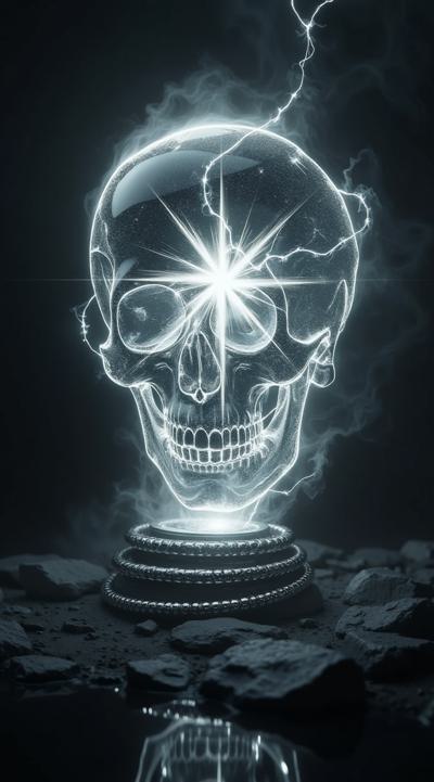 Обложка «КОДЕКС СУВЕРЕНА». В центре парит безупречный череп из прозрачного алмаза. Внутри него сияет ослепительная звезда — источник чистого белого света, заливающий грани холодным огнем. Череп окружен тремя кольцами: застывшая черная тушь, зеркальная сталь и золотой цифровой код 2026 года. Фон — абсолютная черная пустота. Свет исходит только изнутри черепа, создавая резкие контрасты на металле. Минимализм, гиперреализм, макросъемка, 8k. Внизу тонкий серебряный шрифт: КОДЕКС СУВЕРЕНА.