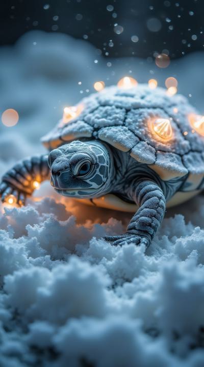 Очень реальная фотография, снята на fujifilm X-T5. К4. Снято в студии. изображен светлый сияющий светящийся маленький умилительный пушистый детеныш черепахи в припорошенном снежке, в бриллиантовой, хрустальной и жемчужной пыли и с большими умилительными глазами и ресницами. Детёныш черепахи лежит на траве на фоне белых еловых пушистых веток и раздвигает ножки в разные стороны. Новогодняя тема. Супер фантазия. Элита, богема, манерность, красота, аристократизм. Гиперреалистичность, супердетализация, стиль vogue, intricate