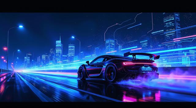 Cinematic horizontal cover art for a VK community called "AI Car Audio". Wide shot of a modern sports car driving on a wet night highway, viewed from a low angle. The car is surrounded by glowing neon blue and purple light trails. In the sky, abstract digital neural network patterns and circuit board lines are visible, merging with the city lights. The atmosphere is dark, futuristic, and aggressive. High contrast, cyberpunk aesthetic, 8k resolution, dramatic lighting, 1590x400 aspect ratio. The text "AI Car Audio" is placed in the center or left side in a bold, modern techno font with a subtle glow.