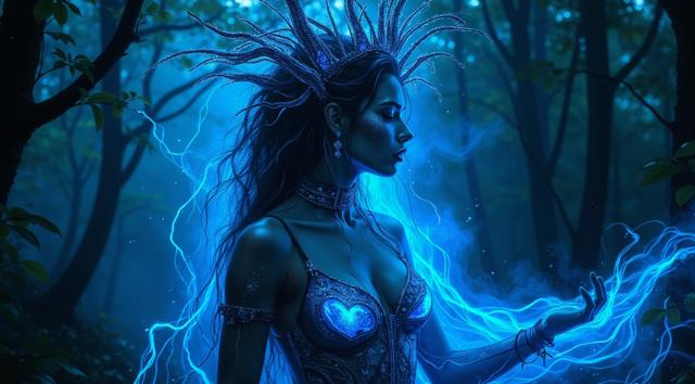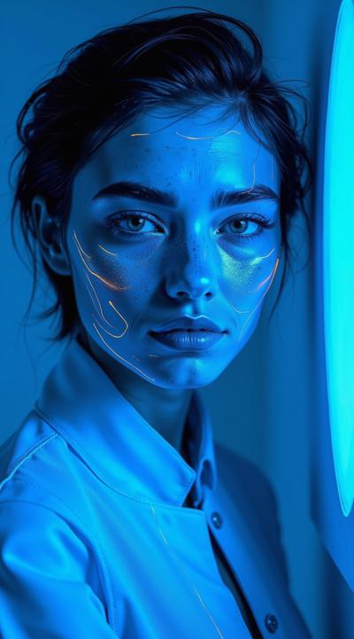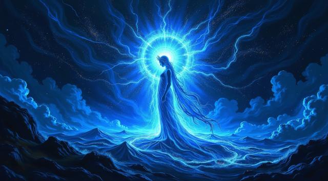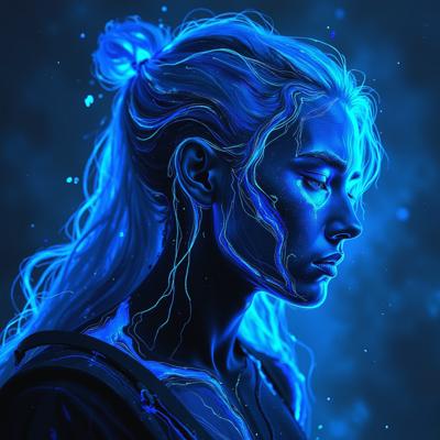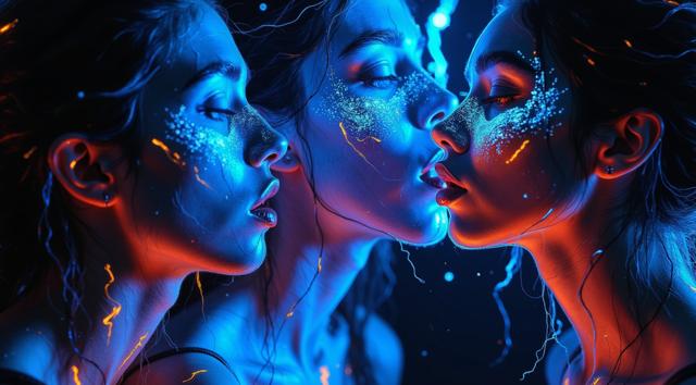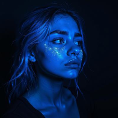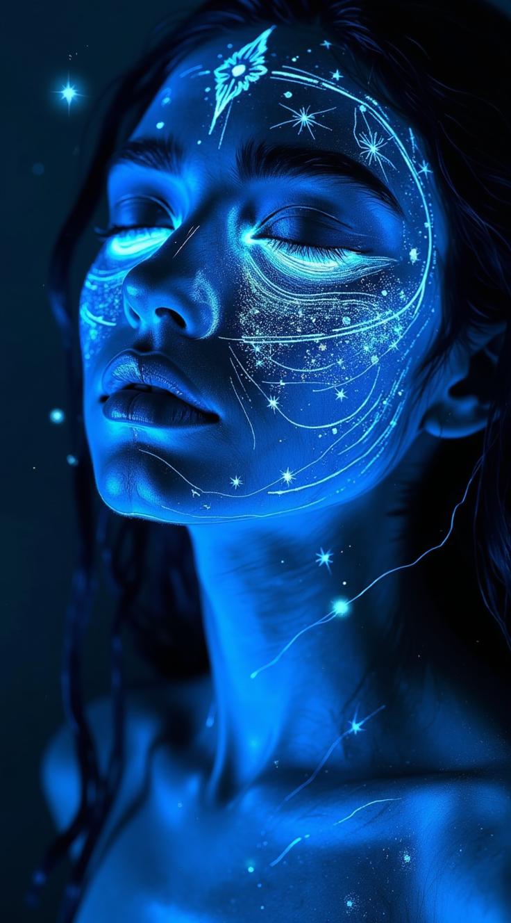 Принцесса с закрытыми глазами, её кожа сияет ровным магическим светом, словно наполнена внутренней энергией. Мы видим ее по пояс. На лице переливающийся узор в виде маски из звёзд и созвездий, напоминающий древний ритуальный символ. Атмосфера мистики и чар, ощущение магического преображения и колдовского ритуала красоты. Фон — глубокий чёрный бархат, усыпанный мерцающими звёздами, словно ночное небо. Лёгкая дымка или сияющий туман вокруг, добавляющий ощущение магии и волшебства. Стиль — мистическая роскошь, соединение таинственности и гламура.