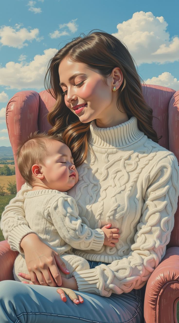 Живопись акрилом, изображена молодая женщина, сидящая в кресле, держащая на руках спящего младенца. Женщина одета в белый вязаный свитер с высоким воротником, у нее длинные каштановые волосы, которые распущены по плечам. Ее глаза закрыты, она смотрит вниз на ребенка с нежной улыбкой., , Младенец завернут в белое кружевное одеяло. Видна его маленькая ручка. У ребенка закрыты глаза, его лицо выглядит спокойным и умиротворенным., , Кресло, в котором они сидят, выполнено из дерева с изогнутой спинкой и подлокотниками. На сиденье и спинке кресла лежит подушка бежевого цвета. За креслом видна стена серого цвета.