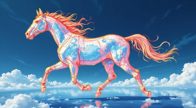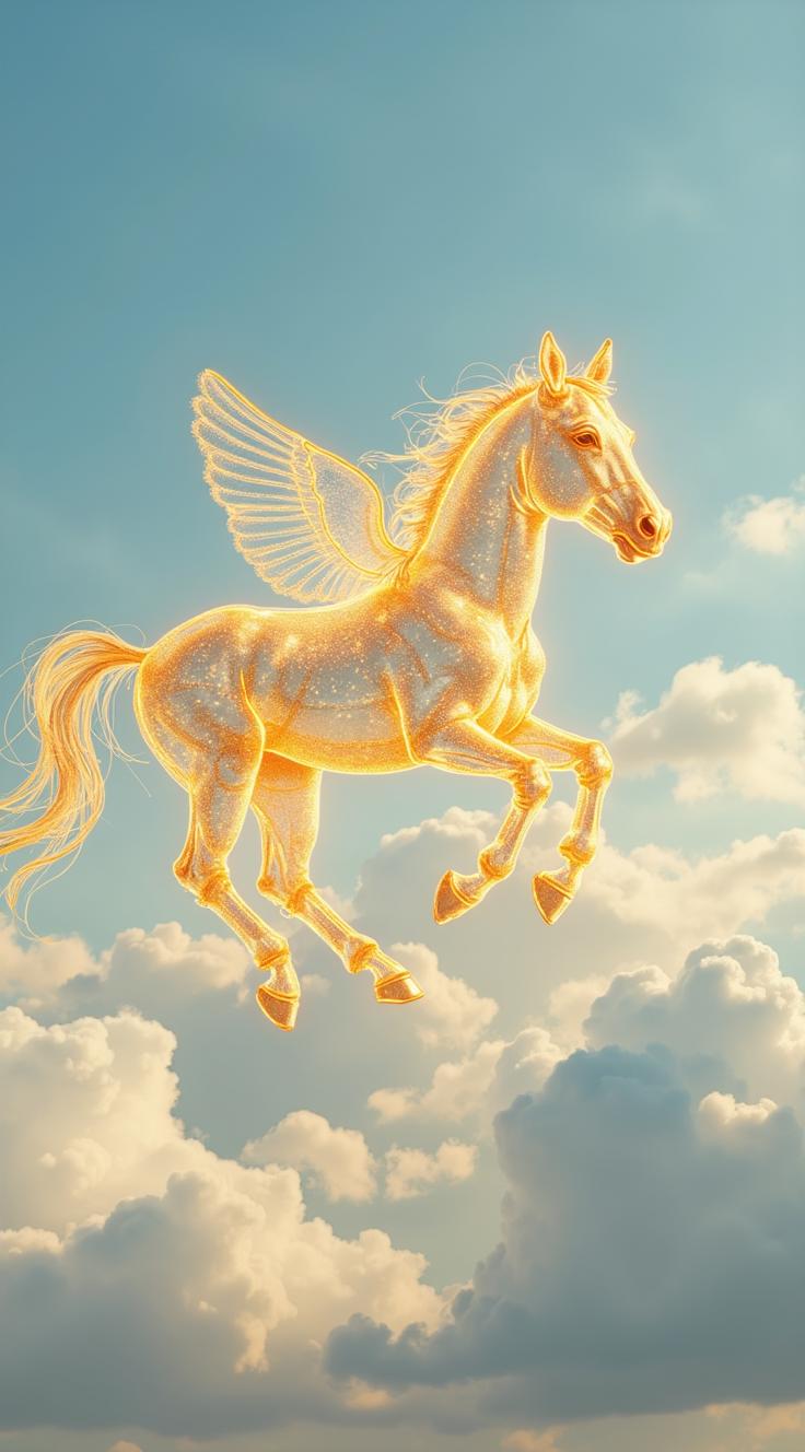 Очень реальная фотография, снята на fujifilm X-T5. К4. Снято в студии - на фоне с белыми кучевыми облаками из светящегося сияющего голографического золота летит прозрачный светлый золотистый сияющий светящийся голографический умилительный детёныш коня с большими глазами и ресницами. Конь летит в воздухе. Супер фантазия, мистика. Элита, богема, манерность, красота, аристократизм. Гиперреалистичность, супердетализация, стиль vogue, intricate