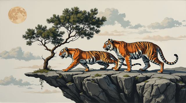 В представленном картине наблюдается сочетание элементов сюрреализма, абстрактного импрессионизма и минимализма. Композиция включает образ двух напряженных, крадущихся тигра, расположенных на фрагменте утёса, на фоне ветки сосны. Цветовая палитра ограничена и выдержана в чёрных, серых, светло-коричневых и охровых тонах, что подчёркивает сдержанность и лаконичность стиля, характерного для минимализма, при этом сохраняя эмоциональную глубину и загадочность, присущие сюрреализму и абстрактному импрессионизму.
