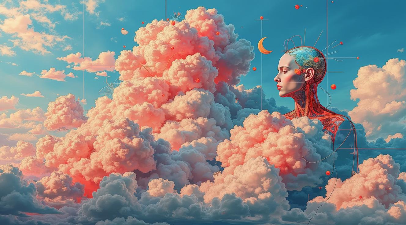 Создай гиперреалистичную фэнтезийную иллюстрацию: женщина с большим бюстом и стройной фигурой с длинными белыми волосами в сверкающем платье с декольте парит среди фантастических цветов. Пастельные тона (сиреневый, перламутровый), мягкий свет сверху, мистическая атмосфера сна. Детализировать текстуры лепестков и ткани.