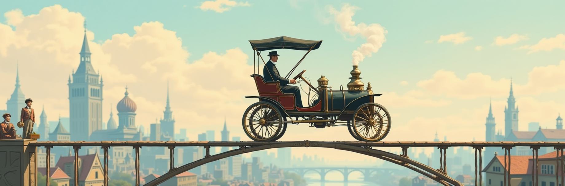 картина в стиле 19 века . Сюрреалистичный автомобиль конца 19 века очень вытянутый без крыши крупным планом . Движется по тонкому арочному мосту на воне панорамы города . Фон пастельно-смазанный с едва просматривающимися силуэтами викторианского города . У автомобиля сзади паровой двигатель с дымящейся трубой . За рулем сидит водитель маленького роста с большой головой , на голове шлем авиатора с защитными очками , во рту курительная трубка. Он одет галифе штаны и ботинки до колена . на автомобиле сидит ворона .