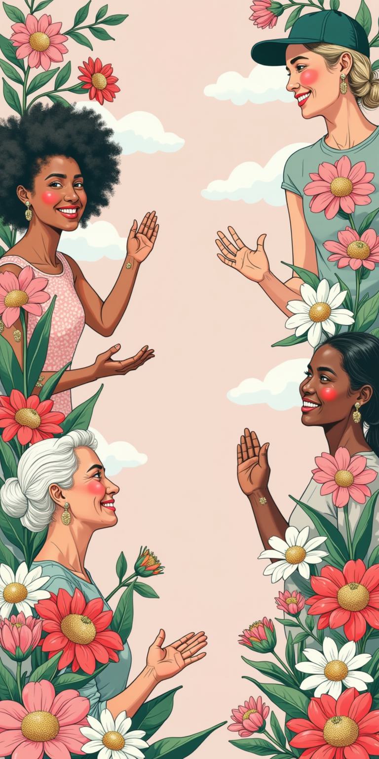 Festive composition for March 8: lush floral background in spring hues (pastel pink, green and white). White-skinned women of different ages cautiously peek out from both sides of the frame, their faces lit up with warm, sincere smiles. Some are waving their hands in greeting, others are holding bouquets of seasonal flowers (tulips, mimosas, hyacinths). The atmosphere is joyful and festive, expressing appreciation and recognition ("Well done!"). Soft diffused lighting creates a gentle glow. Style: Illustration, High detail, 4K
