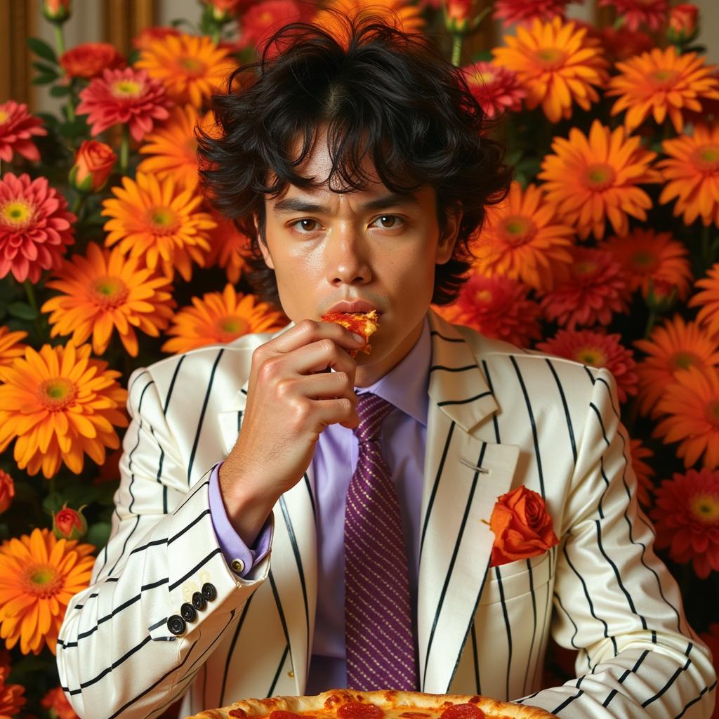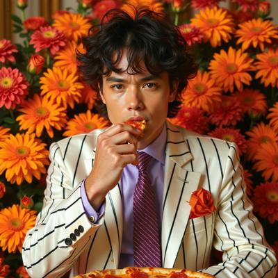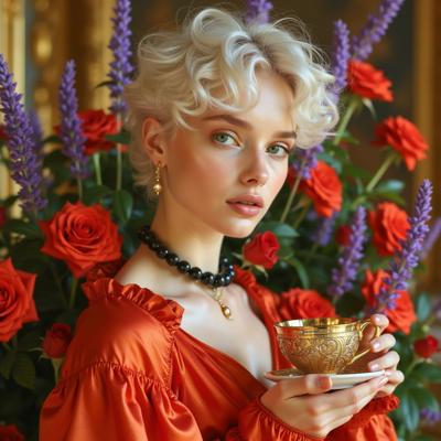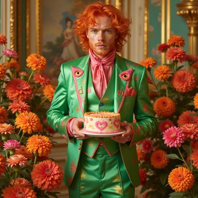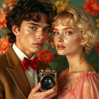 Мужчина с кудрявыми темными волосами. Держит старинный фотоаппарат. Глаза карие. На шее красный бант. На нем коричневый костюм. Он делает портрет девушки с короткими прямыми светлыми волосами. Прическа каре до плеч с челкой. На ней розовое платье в стиле 1920 года. Вокруг хризантемы и алые розы. Версаль. Барокко.