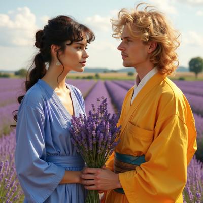 Девушка с длинными темными волнистыми волосами убранными в прическу 1910 годов. Эдвардианская эпоха. Девушка стоит на лавандовом поле и держит букет лаванды. На ней голубое платье. Рядом юноша с длинными светлыми кудрявыми волосами в желтом кимоно. Он держит веточку лаванды и любуется девушкой. На фоне Версаль.