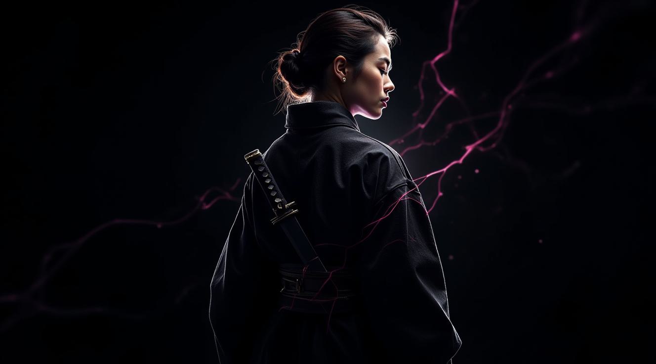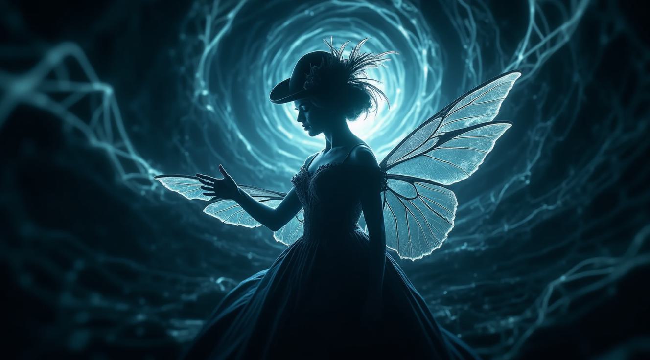Она парит в сумрачном вихре времени, словно призрак викторианской эпохи. Шляпа с перьями дрожит от магической энергии, будто готова взлететь. Кружевные рукава её платья трепещут, как крылья ночной бабочки, а тёмный бархат одежды мерцает в лунном свете. Взгляд — холодный, пронизывающий, будто клинок, готовый рассечь реальность. Тени вокруг неё оживают, шепчут древние тайны.