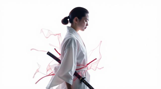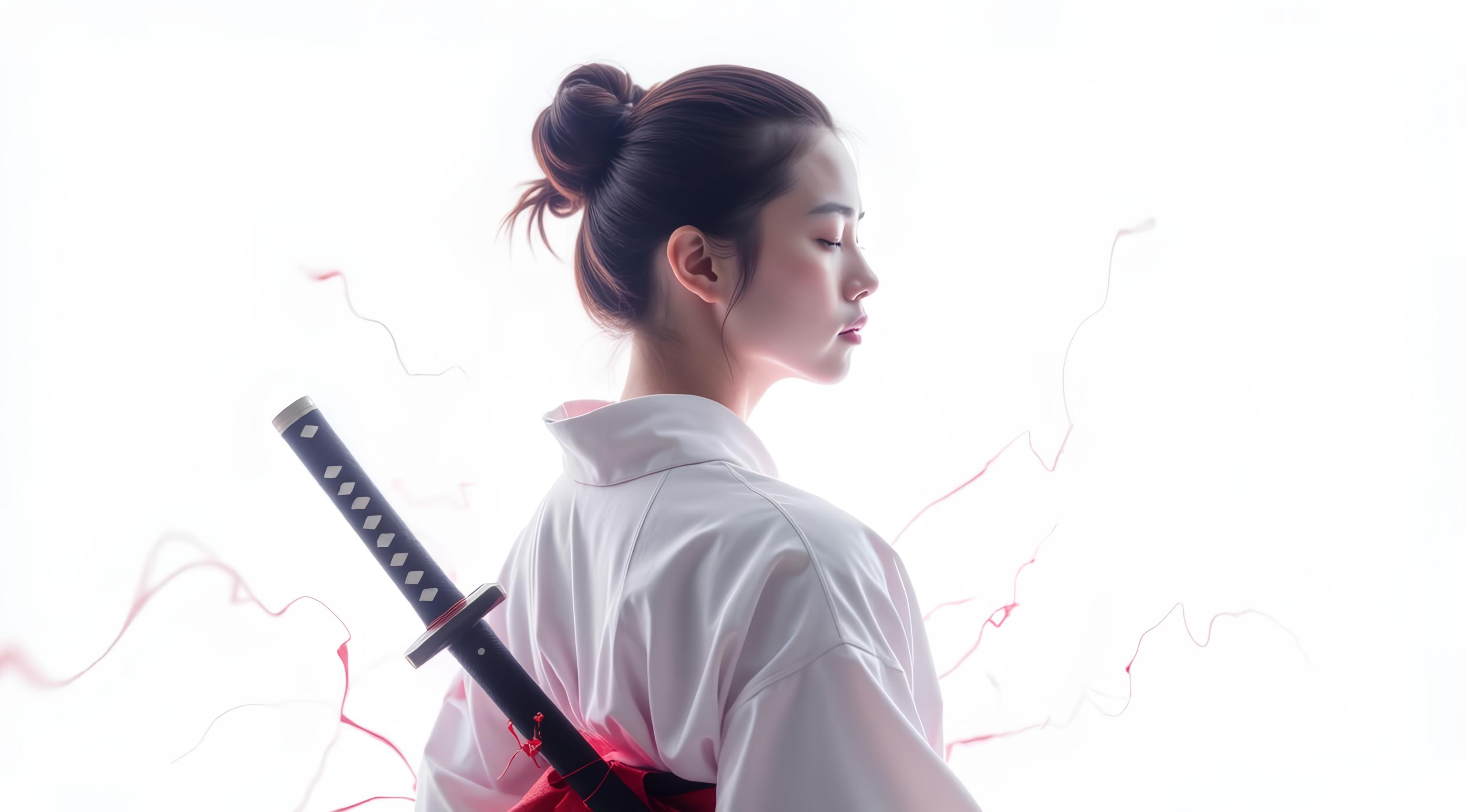 A snow-white demoness with a large bust and slender figure, with long hair, silver eyes, snow-white armor with cleavage, sharp claws and a silver sword walks against the background of a flaming snow portal. White flowers cover her shoulders. The photo has a shallow depth of field and a warm golden light that highlights the texture of the armor and the softness of the hair.