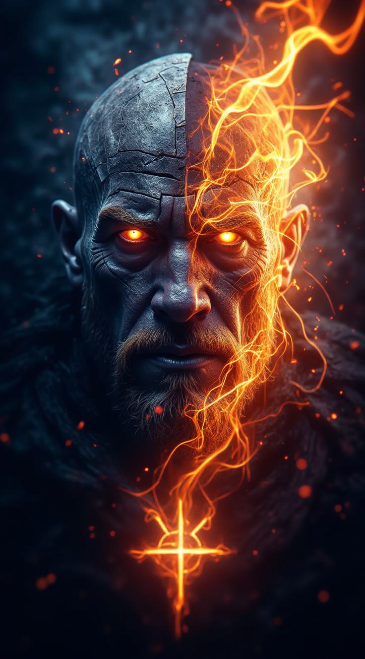 Создай мистический арт: лицо древнего скандинавского воина, наполовину состоящее из камня и дыма, наполовину — из пламени. Глаза воина светятся зловещим оранжевым светом, на лбу — загадочные руны. Пламя динамично обвивает правую часть лица, переходя в огненный символ в нижней части изображения. Фон — тёмный, с мерцающими искрами. Стиль — мрачный, с элементами готики