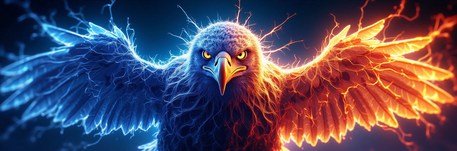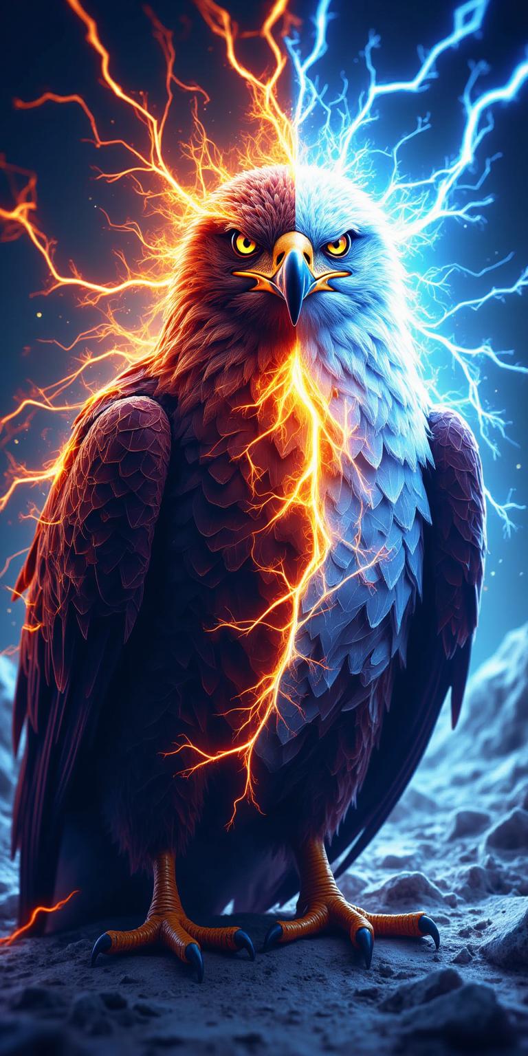 Создай концепт-арт орла для комикса или анимации. Орёл разделён на две половины: огонь и лёд. Огненная сторона: перья напоминают пылающие угли, клюв и когти светятся, как раскалённый металл. Ледяная сторона: перья покрыты морозным узором, клюв и когти — как осколки льда. Выражение лица напряжённое, будто орёл борется с внутренним конфликтом. Стиль — комикс-арт, с чёткими линиями и яркими цветами. Формат — портрет, средний план
