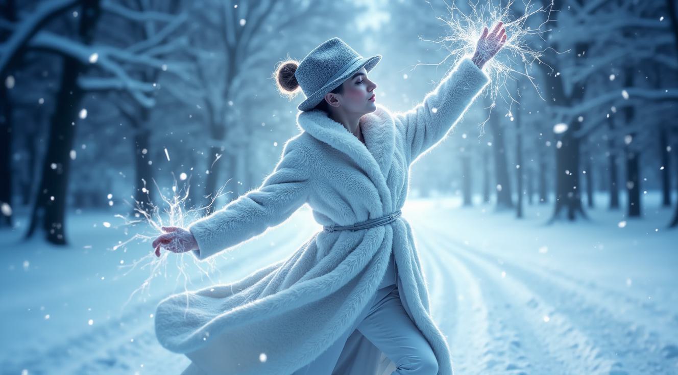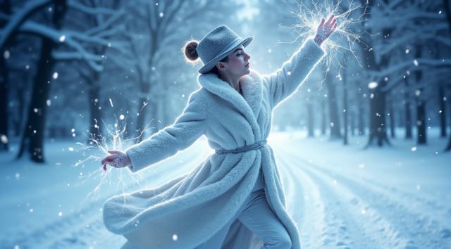 A slender warrior fairy in a sparkling outfit stands amidst snow-covered ruins. Her crystal wings, made from star fragments, shimmer in the fading light. Constellations guide her, and she holds an icy sword with mist rising from its blade. Glowing spheres fill the air with ethereal light. Her intricate feathers seem woven from stars, and frost on her clothing glistens. Her crystal wings refract light, creating a kaleidoscope of colors. She embodies myth and magic.