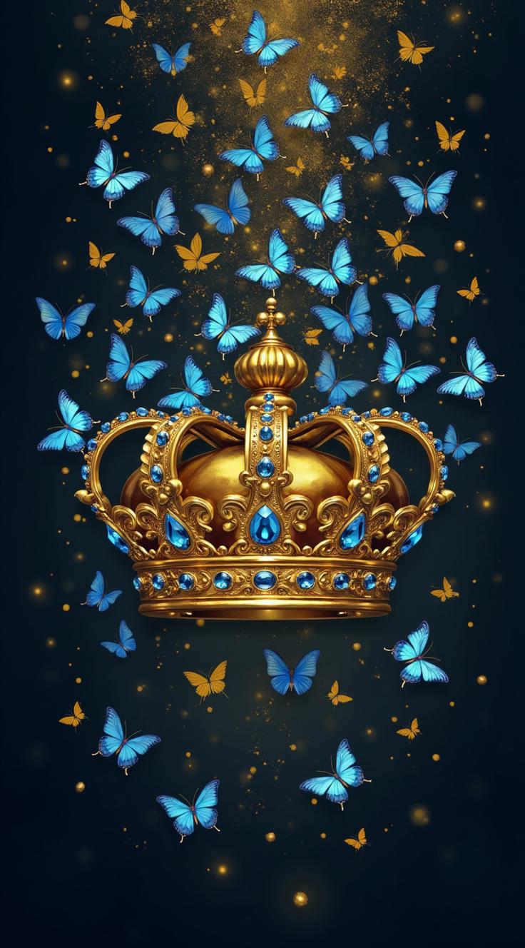 «Создай художественную иллюстрацию: корона из золота с синими камнями, окружённая роем изящных голубых бабочек. Бабочки словно рождаются из короны, наполняя пространство магией. Тёмный, приглушённый фон, мягкие тени, эстетика роскоши и загадочности. Изображение должно вызывать ощущение королевской тайны и волшебства.