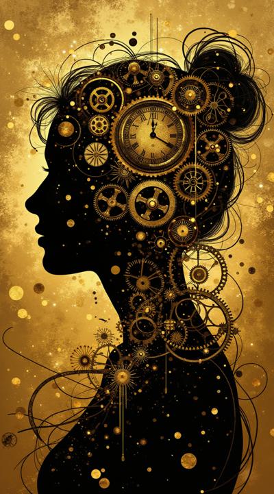 Создай арт-изображение женщины в профиль. Силуэт выполнен в чёрном цвете, фон — золотой градиент. Укрась силуэт сложными механическими деталями: шестерёнки разного размера, трубы, винтики, элементы часового механизма. Добавь декоративные линии и круги, создающие ощущение движения. Стиль — стимпанк с элементами ар-деко. Глаза женщины закрыты, выражение лица спокойное