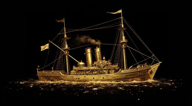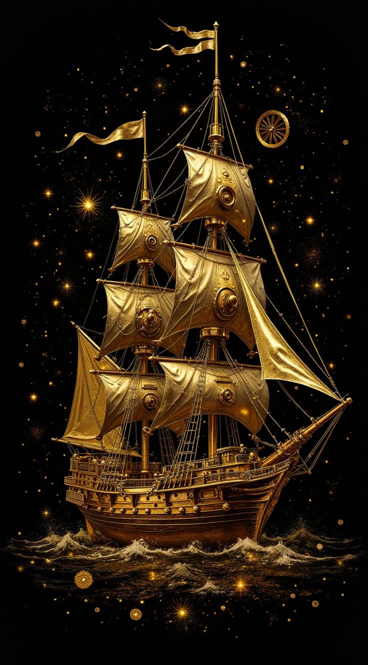 Основной фон — глубокий чёрный, украшенный золотыми голографическими узорами. Создай арт-изображение стимпанк-корабля. Фон — абсолютно чёрный, корабль выполнен в золотых и бронзовых оттенках. Изобрази сложные механические детали: шестерёнки, трубы, клапаны. Корабль должен иметь три мачты с парусами, украшенными орнаментами. Добавь декоративные завитки вокруг корпуса. Стиль — киберпанк с элементами ар-деко. Вертикальная композиция, создающая ощущение роскоши и технологичности