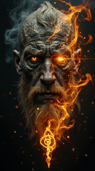 Создай мистический арт: лицо древнего скандинавского воина, наполовину состоящее из камня и дыма, наполовину — из пламени. Глаза воина светятся зловещим оранжевым светом, на лбу — загадочные руны. Пламя динамично обвивает правую часть лица, переходя в огненный символ в нижней части изображения. Фон — тёмный, с мерцающими искрами. Стиль — мрачный, с элементами готики