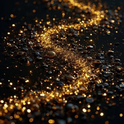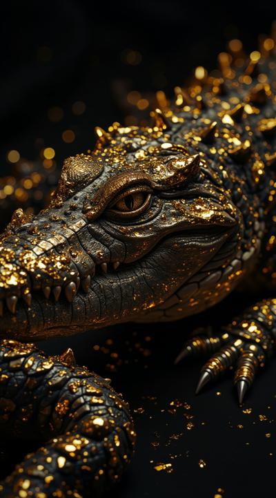Представь фантазийную текстуру кожи мифического крокодила. Используй глубокие чёрные и тёмно-золотые оттенки, создай ощущение металлического блеска на чешуйках. Чешуйки должны выглядеть массивными, с выраженными трещинами и рельефом, будто это броня древнего существа. Вертикальная композиция, добавь лёгкое мерцание на бликах для мистической атмосферы