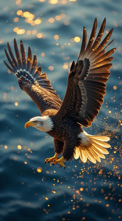 Представь белоголового орлана как символ свободы и силы, парящего над бескрайним голубым простором. Крылья раскинуты в величественном жесте, перья переливаются на свету. Фон — абстрактное сочетание неба и воды, создающее ощущение бесконечности. Добавь лёгкую дымку, подчёркивающую высоту полёта. Стиль — смесь реализма и художественной стилизации, с акцентом на драматизм и мощь образа.