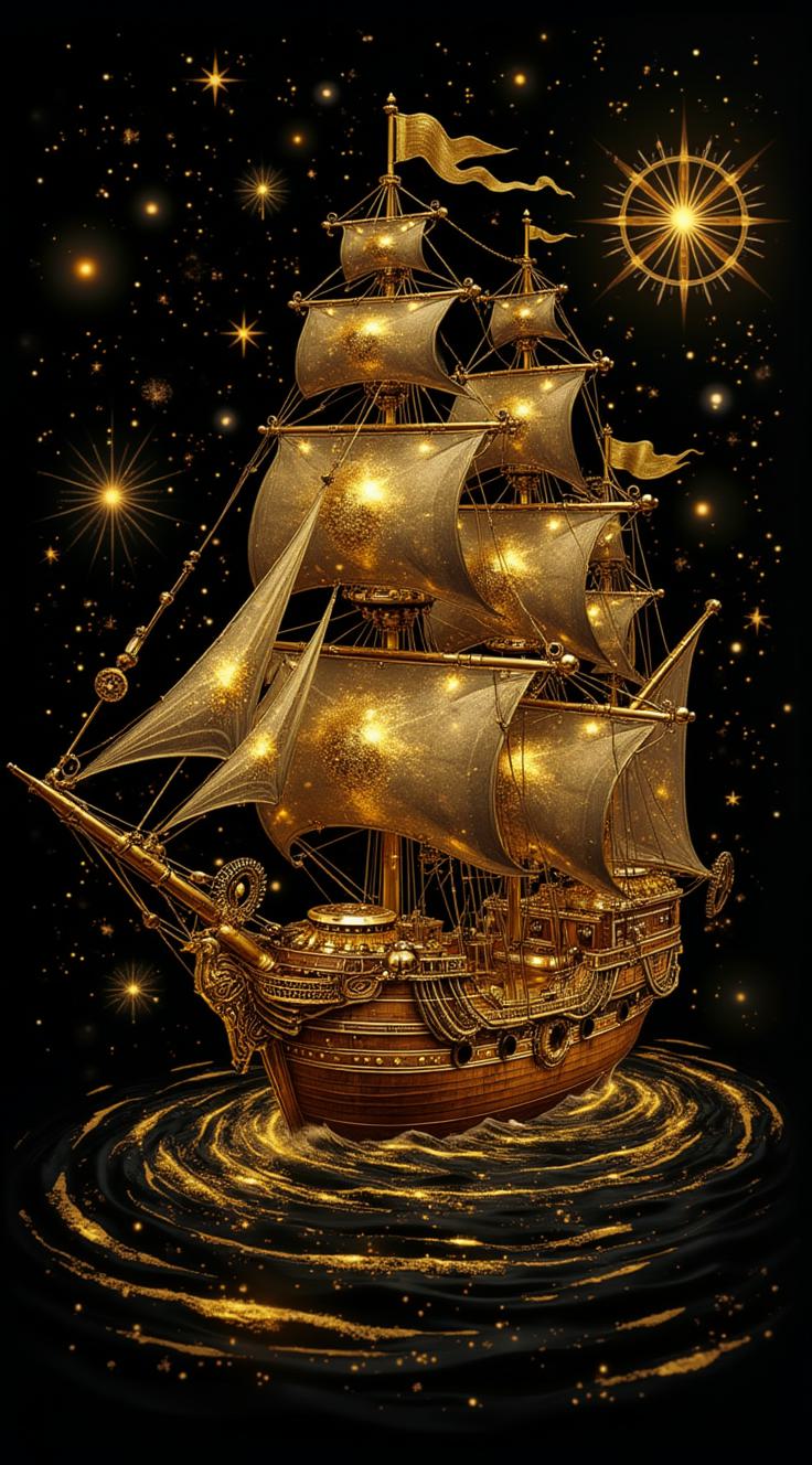 Представь фантастический стимпанк-корабль, будто он плывёт по звёздному небу. Корабль выполнен в золотых тонах, с элементами механики: шестерёнки, трубы, поршни. Паруса украшены узорами, напоминающими созвездия. Вокруг корабля — завитки и спирали, создающие ощущение движения. Фон — чёрный космос с мерцающими звёздами. Стиль — сюрреалистичный, с атмосферой приключения и тайны.