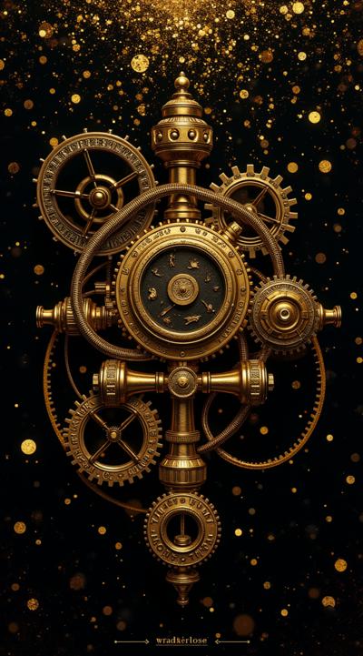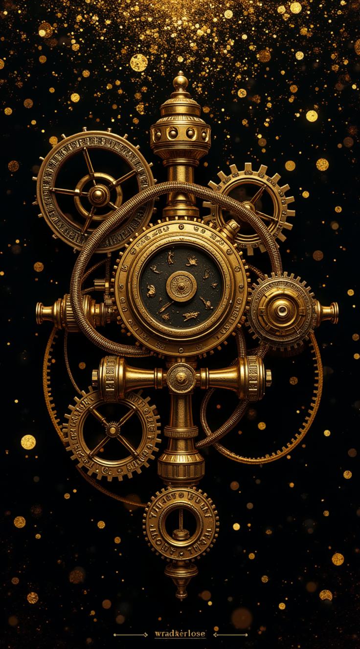 Основной фон — глубокий чёрный, украшенный золотыми голографическими узорами. В центре — арт-композиция: стимпанк-текстуру, будто это фрагмент обшивки дирижабля из альтернативного мира. Изобрази переплетение золотых и бронзовых труб, шестерёнок с витиеватыми узорами, декоративных клапанов с гравировкой. Добавь миниатюрные детали: крошечные гаечные ключи, винтики, фрагменты карт. Фон — тёмно-угольный, с мерцающими искрами, имитирующими искры от парового механизма. Вертикальная композиция, мистическая атмосфера. Стиль — киберпанк с элементами ар-деко. Вертикальная композиция, создающая ощущение роскоши и технологичности