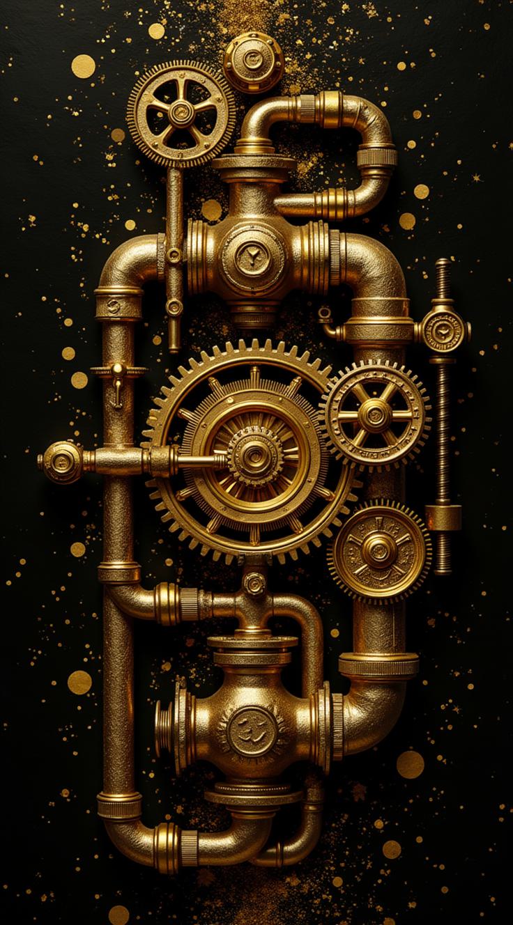 Основной фон — глубокий чёрный, украшенный золотыми голографическими узорами. В центре — арт-композиция: стимпанк-текстуру Изобрази переплетение золотых и бронзовых труб, шестерёнок с витиеватыми узорами, декоративных клапанов с гравировкой. Добавь миниатюрные детали: крошечные гаечные ключи, винтики, фрагменты карт. Фон — тёмно-угольный, с мерцающими искрами, имитирующими искры от парового механизма. Вертикальная композиция, мистическая атмосфера. Стиль — киберпанк с элементами ар-деко. Вертикальная композиция, создающая ощущение роскоши и технологичности