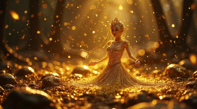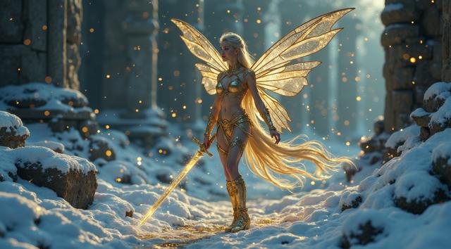 A slender warrior fairy in a sparkling outfit stands amidst snow-covered ruins. Her crystal wings, made from star fragments, shimmer in the fading light. Constellations guide her, and she holds an icy sword with mist rising from its blade. Glowing spheres fill the air with ethereal light. Her intricate feathers seem woven from stars, and frost on her clothing glistens. Her crystal wings refract light, creating a kaleidoscope of colors. She embodies myth and magic.