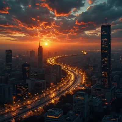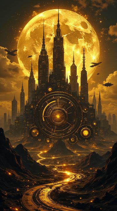 Создай арт-изображение футуристического города в стиле стимпанк. На фоне — огромная золотистая луна. В центре композиции — силуэты небоскрёбов с антеннами и шпилями. На переднем плане — крупные механические шестерёнки, циферблаты часов и схемы, напоминающие электронные цепи. В небе — несколько летательных аппаратов и птиц. Цветовая гамма: чёрный и золотой с акцентами тёмно-серого. Вертикальная композиция, акцент на контрасте между механикой и архитектурой