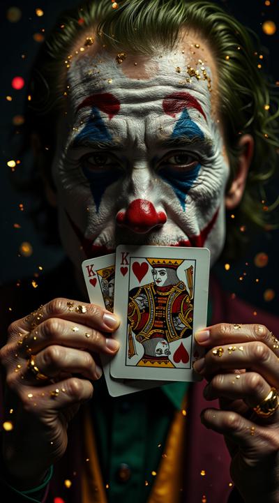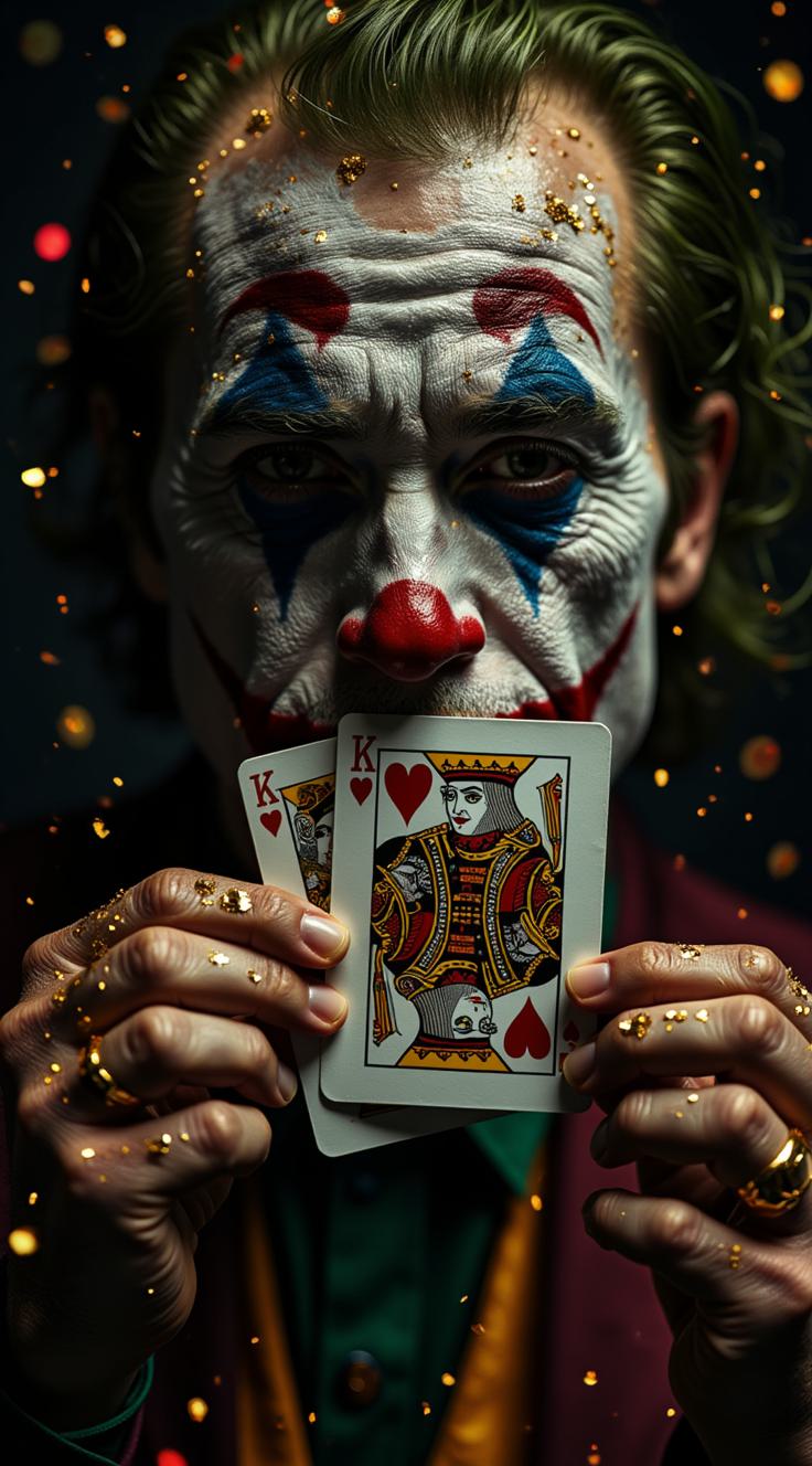 , Описание: Джокер с выраженным макияжем под карнавальный стиль, держит карту короля. Фон темный с разноцветными конфетти и глянцевыми поверхностями., Композиция: крупный план лица, ярко выраженные контуры лица и блестящие детали карты., Стиль: графический темпоральный киберпанк с плавными бликами и контрастами.