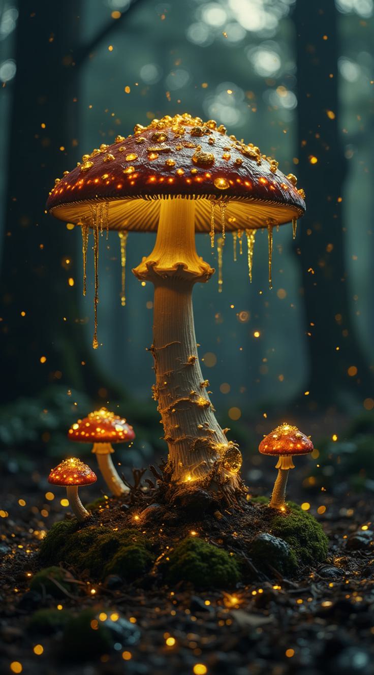 Представь зловещий лес, где природа и смерть переплелись в жутком симбиозе. В центре сцены — гигантский гриб, чья ножка превратилась в череп, словно хранитель этого мрачного места. Его шляпка украшена светящимися пятнами, а с краёв стекает вязкая жидкость. Вокруг — меньшие грибы, повторяющие облик своего «короля», и множество черепов, будто выросших из земли. Туман и искривлённые ветви деревьев создают атмосферу кошмара. Цветовая палитра — мрачные зелёные и чёрные тона с акцентами бледного света. Передай ощущение древней магии и опасности, таящейся в этом лесу
