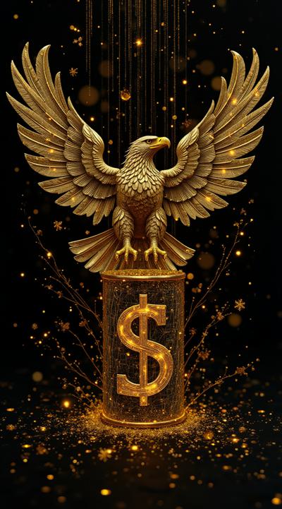 Представь футуристическую интерпретацию 100-долларовой купюры. Основной фон — глубокий чёрный, украшенный золотыми голографическими узорами. В центре — арт-композиция: орёл, словно сделанный из золотых нитей, цилиндр с интегрированными символами доллара, напоминающими кибернетические схемы, и динамичные золотые жесты рук, будто парящие в воздухе. Стиль — киберпанк с элементами ар-деко. Вертикальная композиция, создающая ощущение роскоши и технологичности
