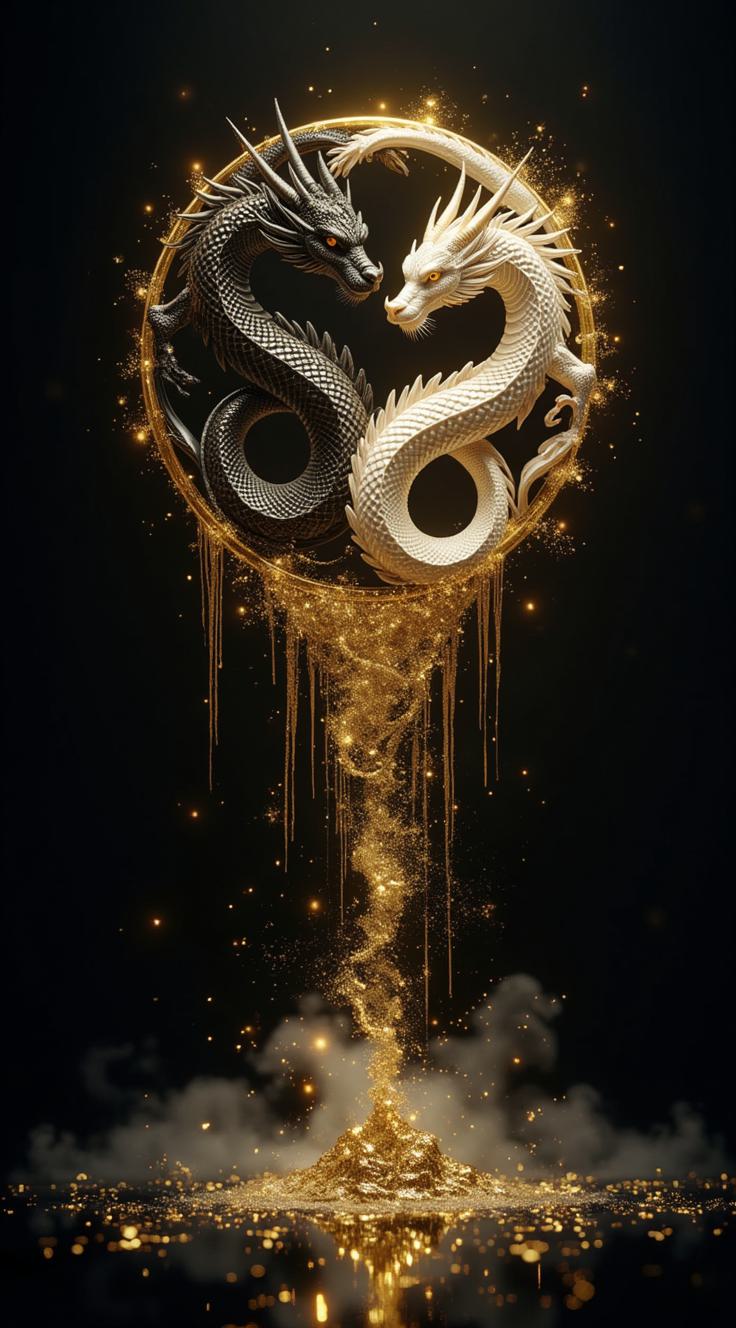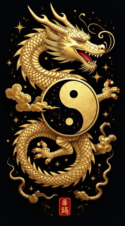 Создай художественную иллюстрацию: величественный китайский дракон с золотыми акцентами обвивает символ Инь-Ян. Дракон детализирован: видны чешуйки, когти, усы. Символ Инь-Ян расположен в центре композиции, чётко выделяется на фоне. Вокруг дракона и символа — стилизованные золотые облака. Фон — глубокий чёрный цвет. Композиция вертикальная