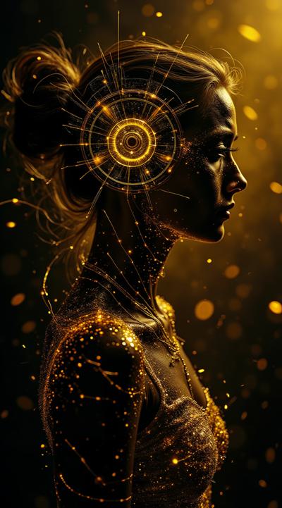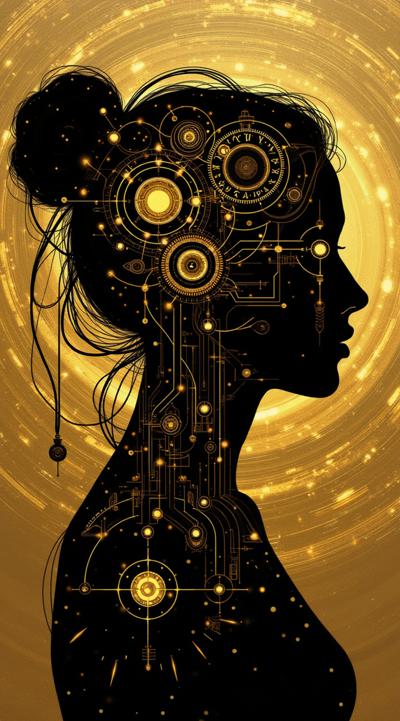 Представь женщину в профиль как воплощение кибернетического разума. Силуэт выполнен в чёрном цвете на золотом фоне. Вместо волос и одежды — сложная сеть стимпанк-механизмов: шестерёнки, трубы, миниатюрные приборы. Добавь ощущение движения: некоторые элементы будто парят или вращаются. Глаза женщины закрыты, что создаёт мистическую атмосферу. Стиль — смесь стимпанка, сюрреализма и футуризма.