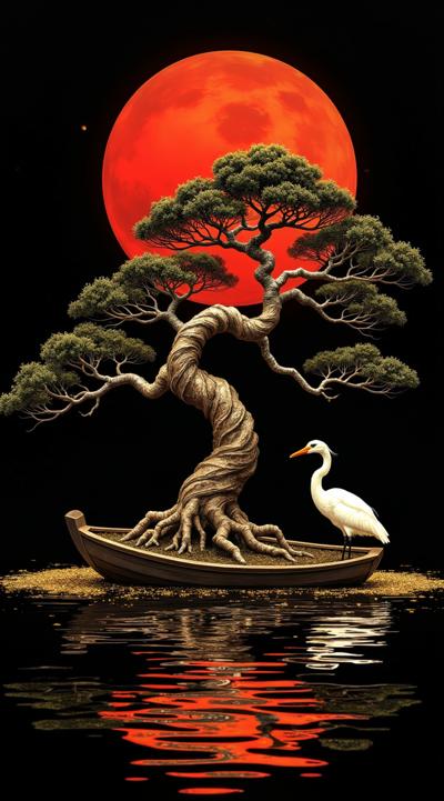 Создай медитативную японскую иллюстрацию: лодка с бонсай, чьи корни сплетаются в замысловатый узор. Рядом — изящная белая цапля. На фоне — величественное красное солнце, погружающее сцену в тёплую, но загадочную атмосферу. Чёрная вода отражает все элементы, усиливая ощущение спокойствия и гармонии. Используй насыщенные красные и белые оттенки, подчёркивая контраст и красоту простоты.