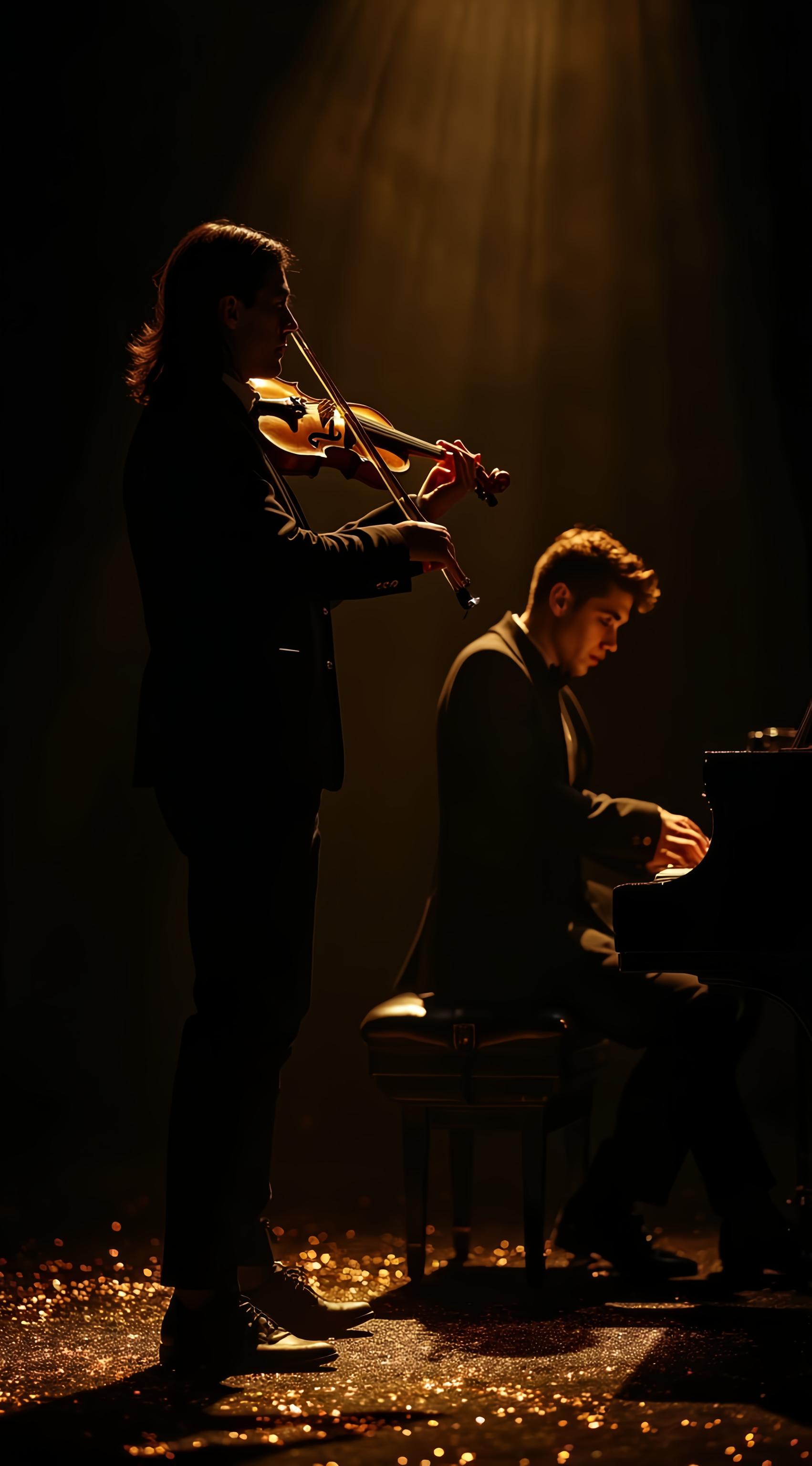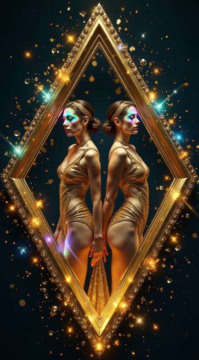 , Описание: пара персонажей в костюмах в духе ар-деко, выходящие из большого бриллиантового игрального поля., Композиция: симметричная композиция, резкие графические линии, золотые акценты., Элементы: золотистые рамы, глянцевые поверхности, многоцветные грани кристаллов, глубокий темно-синий фон., Стиль лица: стилизованный, без точной копии лиц актёров; акцент на характерной улыбке и макияже.