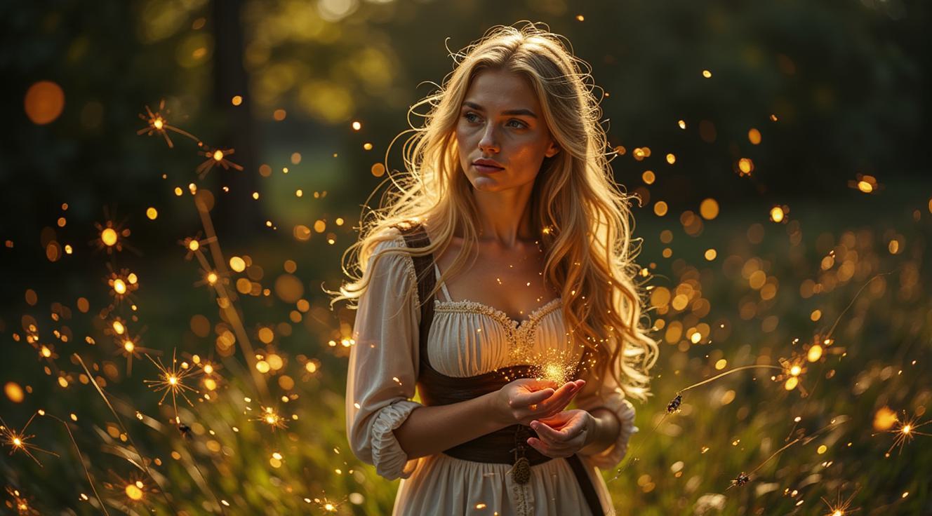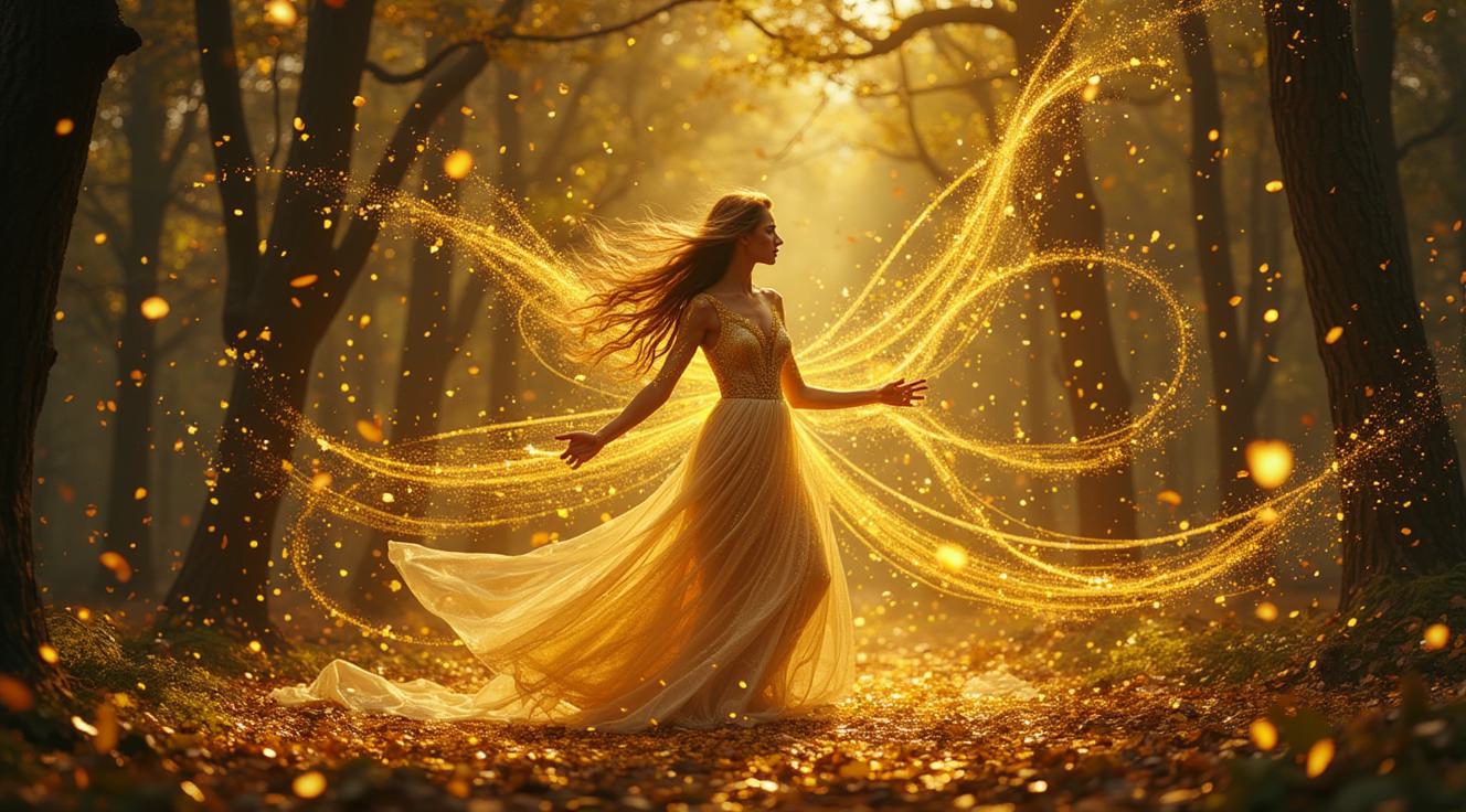 Зажигательный танец волшебницы в полный рост среди зачарованного леса. Золотая аура окружает её, пульсируя в такт движениям. Магия струится, словно вихрь лепестков, а солнечные лучи преломляются в искрах алмазной пыли. Игра света и тени создаёт волшебные узоры. Стиль: импрессионизм, акварель. Сверхдетализация, прорисовка золотом и серебром, шиммер, неоновая подсветка.