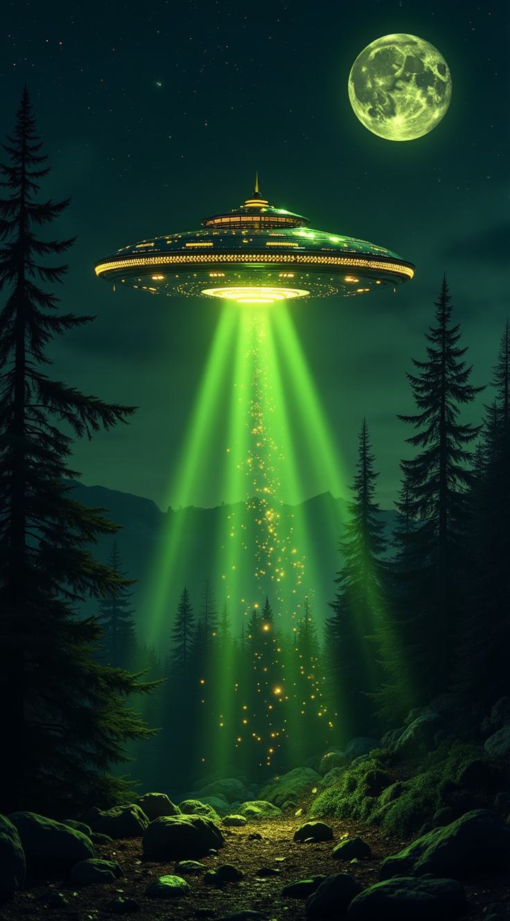 Представь мистическую сцену встречи Земли с внеземной цивилизацией: над зачарованным ночным лесом зависла классическая летающая тарелка. Её мощный зелёный луч в диагонали пронзает тьму, освещая верхушки хвойных деревьев и создавая ощущение тайны. Полумесяц с кратерами наблюдает за этим событием с правого верхнего угла, словно свидетель из другого мира. Атмосфера наполнена ощущением загадки и предвкушения контакта. Используй контрастные чёрно-белые силуэты деревьев и насыщенные цвета для НЛО и луча, чтобы усилить драматизм сцены.