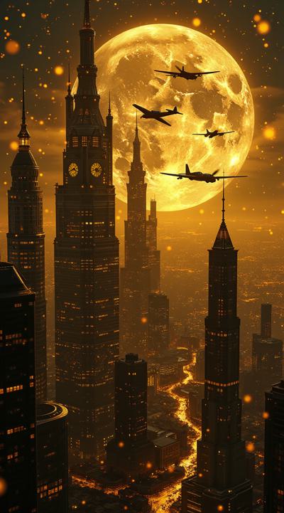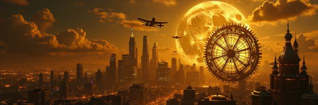 Представь город будущего как единый механизм, работающий в ритме времени. На фоне — гигантская луна, заливающая город золотым светом. Силуэты небоскрёбов плавно переходят в шестерёнки и циферблаты часов, создавая ощущение, что здания — часть огромного часового механизма. В небе парят винтажные летательные аппараты, а птицы кажутся миниатюрными винтиками в этом механизме. Цветовая гамма — чёрно-золотая с мистическим налётом. Стиль — смесь стимпанка, сюрреализма и футуризма