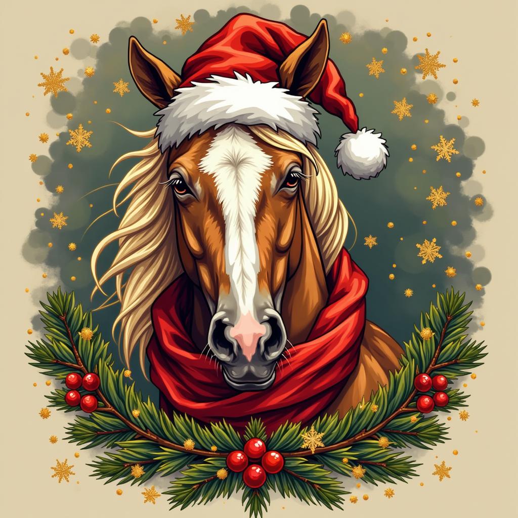 Создайте веселый и забавный принт для майки на новогоднюю тематику, в центре которого будет изображена лошадь в рождественском наряде. Лошадь должна быть одета в красный рождественский колпак и шарф, с веселым выражением лица. Добавьте к изображению элементы новогоднего декора, такие как гирлянды, снежинки и подарки, чтобы создать атмосферу праздника. Принт должен быть ярким, игривым и вызывать улыбку, идеально подходящим для новогоднего настроения.