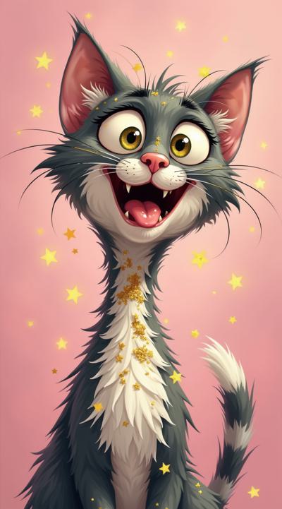 оздай забавный портрет кота в мультяшном стиле. Передай озорной характер через преувеличенные черты: огромные глаза, вытянутую шею, высунутый язык. Шерсть прорисуй детально, с сочетанием серых и белых оттенков. Усы сделай динамичными, будто кот только что пошутил. Фон выполни в нежно-розовых тонах с лёгкими акварельными пятнами, чтобы подчеркнуть игривость образа. Композиция — крупный план головы и верхней части шеи кота
